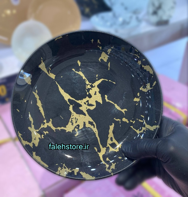 ✨ بشقاب شیشهای رنگی طرح ماربل آرکوفام ترکیبی چشمنواز از مشکی و رزگلد مایل به طلایی است که جلوهای لوکس و مدرن به میز سرو شما میبخشد. رگههای طلایی روی زمینهی تیره، حس ظرافت و شکوه را القا میکنند؛ گویی هر بشقاب، تابلویی از سنگ مرمر سیاه با لمس نور طلایی است.